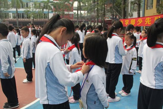 情系领巾,心怀梦想,看星星在闪耀,火炬在燃烧,新时代的队员就是新时代的希望。在庄严的队旗下,老队员为新队员系上了鲜艳的红领巾。我校全体少先队员,高高地举起右手,光荣宣誓:“时刻准备着为共产主义事业而奋斗!”一字一句铿锵有力,充分显示了作为社会主义事业接班人的信心和决心。